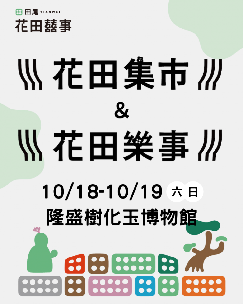 「2025台灣設計展」系列活動(((田尾行|花田囍事)))即將在114年10月18日、19日10:00-18:00在隆盛樹化玉博物館舉辦「花田集市」及「花田樂事」活動,內容包含在地商家花卉植栽市集與現場音樂表演,邀請民眾及同仁共度花田假期。