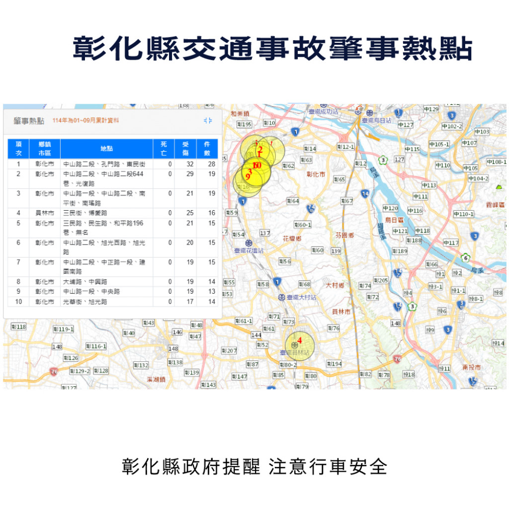 | 二、 | 根據交通部道安資訊查詢網,本縣114年1-9月道路交通事故與112年同期比較分析,以少年自行車騎士(含電自、電輔) 事故增加45%最高,外籍人士事故增加34.3%次之,自小客車駕駛人增加26%再次之。1-9月份鄉鎮市30日死亡人數於「彰化市、員林市、二林鎮」為多,肇事熱點以「彰化市」為多。 |