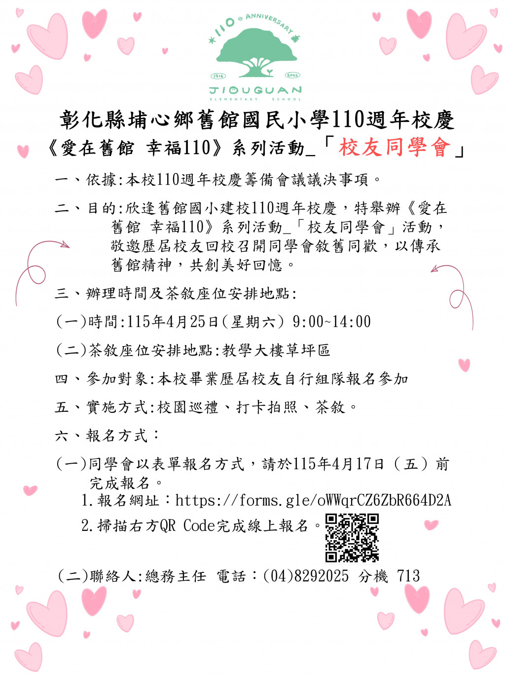 二、目的:欣逢舊館國小建校110週年校慶,特舉辦《愛在舊館 幸福110》系列活動_「校友同學會」活動,敬邀歷屆校友回校召開同學會敘舊、同歡,以傳承舊館精神,共創美好回憶。