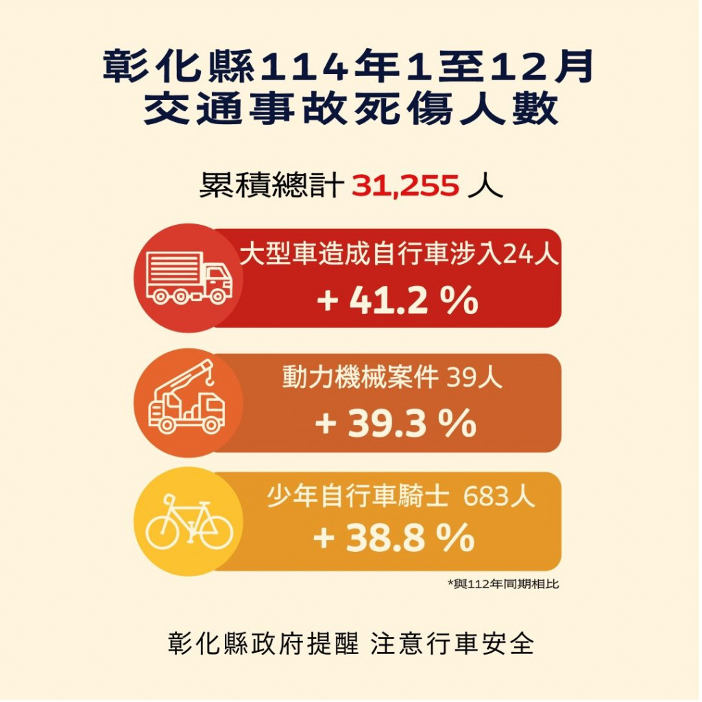 | 二、 | 根據交通部道安資訊查詢網,本縣114年1-12月道路交通事故與112年同期比較分析,以大型車造成自行車涉入(含電自、電輔)事故增加41.2%最高, 動力機械案件 增加39.3%次之。少年自行車騎士(含電自、電輔) 增加38.8%再次之。1-12月份鄉鎮市30日死亡人數於「彰化市、員林市、鹿港鎮」為多,肇事熱點以「彰化市」為多。 |