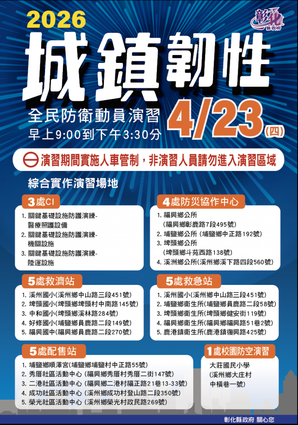 旨揭宣傳重點事項如下: (一)文字宣傳內容如下:彰化縣政府謹訂於115年4月23日(星期四)於福興鄉、埔鹽鄉、埤頭鄉、溪州鄉等4個鄉(鎮、市)辦理彰化縣2026城鎮韌性(全民防衛動員)演習。 (二)需宣傳資料如下: 1、推廣內政部消防署「爭取三天,爭取更多時間」系列緊急避難包宣導影片。 2、推廣師生及民眾下載「警政服務APP」、「消防防災e點通APP」。 (三)內政部消防署「爭取三天,爭取更多時間」系列檔案,
